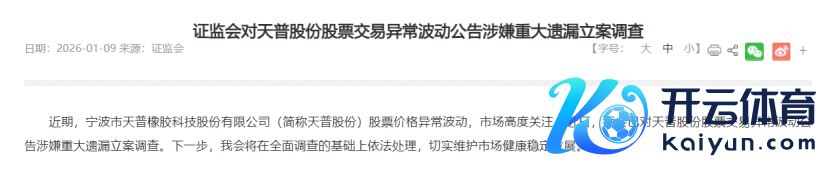 1月9日晚间,证监会发布公告,宁波市天普橡胶科技股份有限公司(简称天普股份)股票价钱相配波动,市集高度温雅。近日,证监会已对天普股份股票往来相配波动公告涉嫌谬误遗漏立案探访。下一步,证监会将在全面探访的基础上照章处理,切实贵重市集健康褂讪发展。
