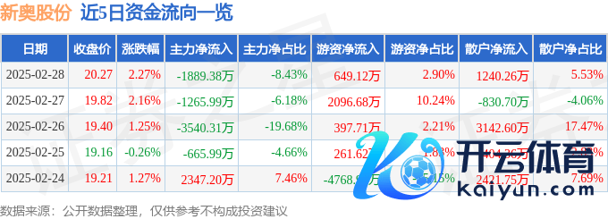 本站音信,收尾2025年2月28日收盘,新奥股份(600803)报收于20.27元云开体育,上升2.27%,换手率0.39%,成交量11.21万手,成交额2.24亿元。