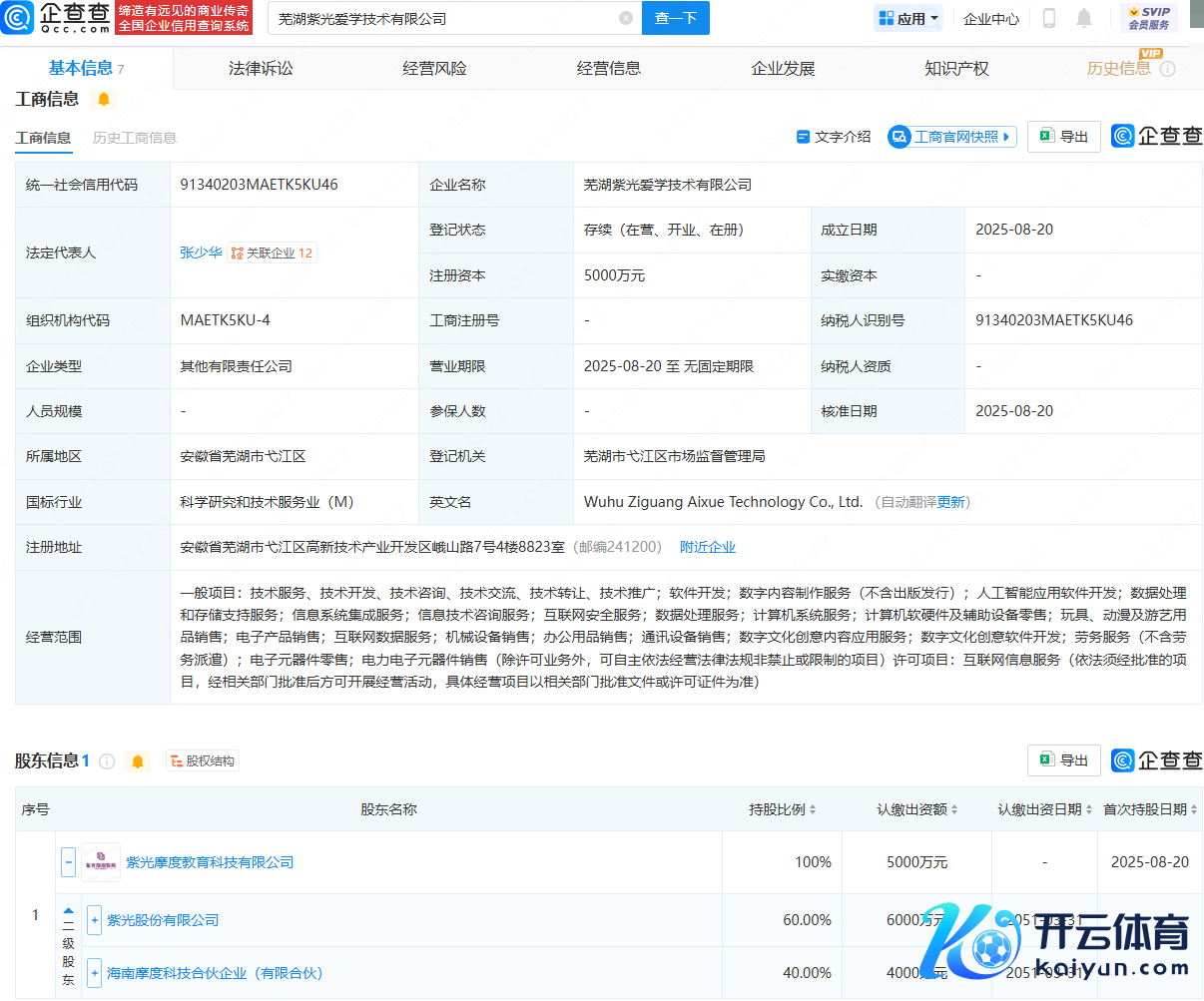 企查查APP露出,近日,芜湖紫光爱学期间有限公司修复,法定代表东谈主为张少华,注册老本为5000万元,计较界限包含:东谈主工智能欺诈软件劝诱;数据责罚和存储复古劳动;信息系统集成劳动;互联网安全劳动等。企查查股权穿透露出开yun体育网,该公司由紫光股份(000938)旗下紫光摩度诠释科技有限公司全资捏股。