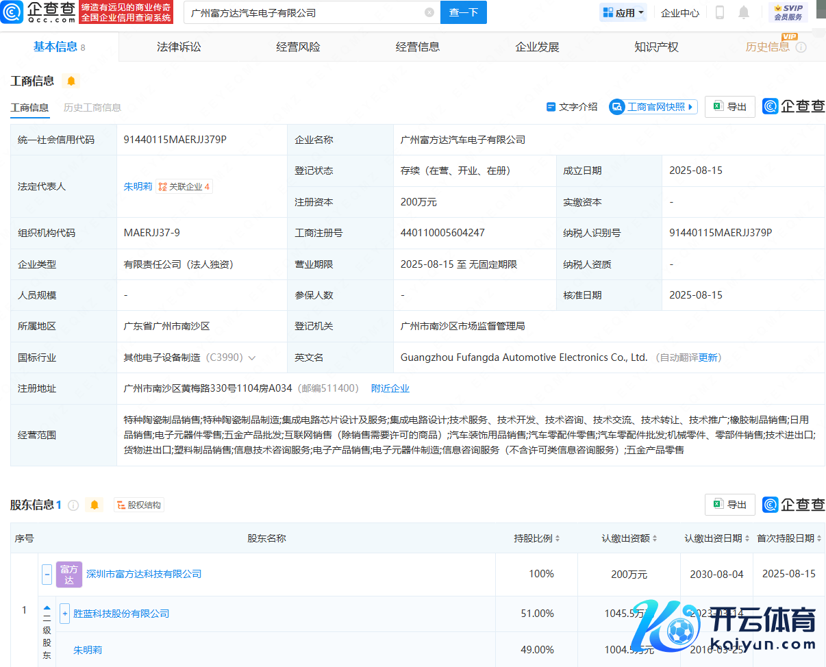 企查查APP领略,近日,广州富方达汽车电子有限公司缔造,法定代表东谈主为朱明莉,主义边界包含:特种陶瓷成品销售;集成电路芯片策画及管事;集成电路策画;电子元器件零卖;五金产物批发等。企查查股权穿透领略开云体育(中国)官方网站,该公司由深圳市富方达科技有限公司全资捏股,后者由胜蓝股份(300843)、朱明莉共同捏股。