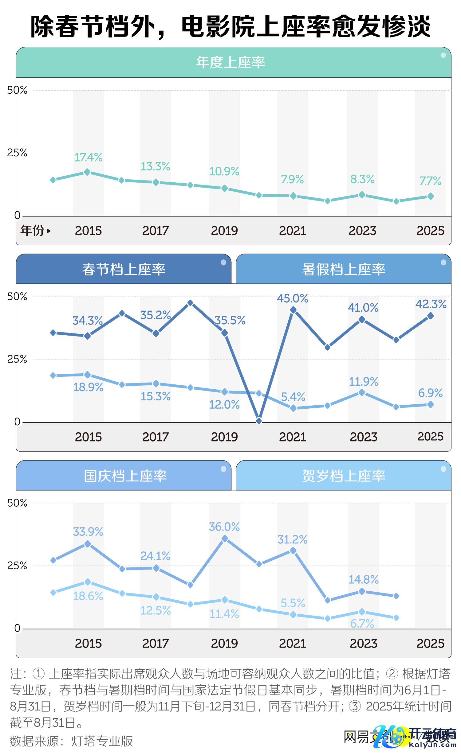 2024年,寰宇电影院年度上座率跌到历史低点5.7%,这意味着一场百东谈主影厅的电影,可能唯有五六个东谈主在看。哪怕是四大黄金档期,除了全年 MVP 的春节档,其余都留不住不雅众。