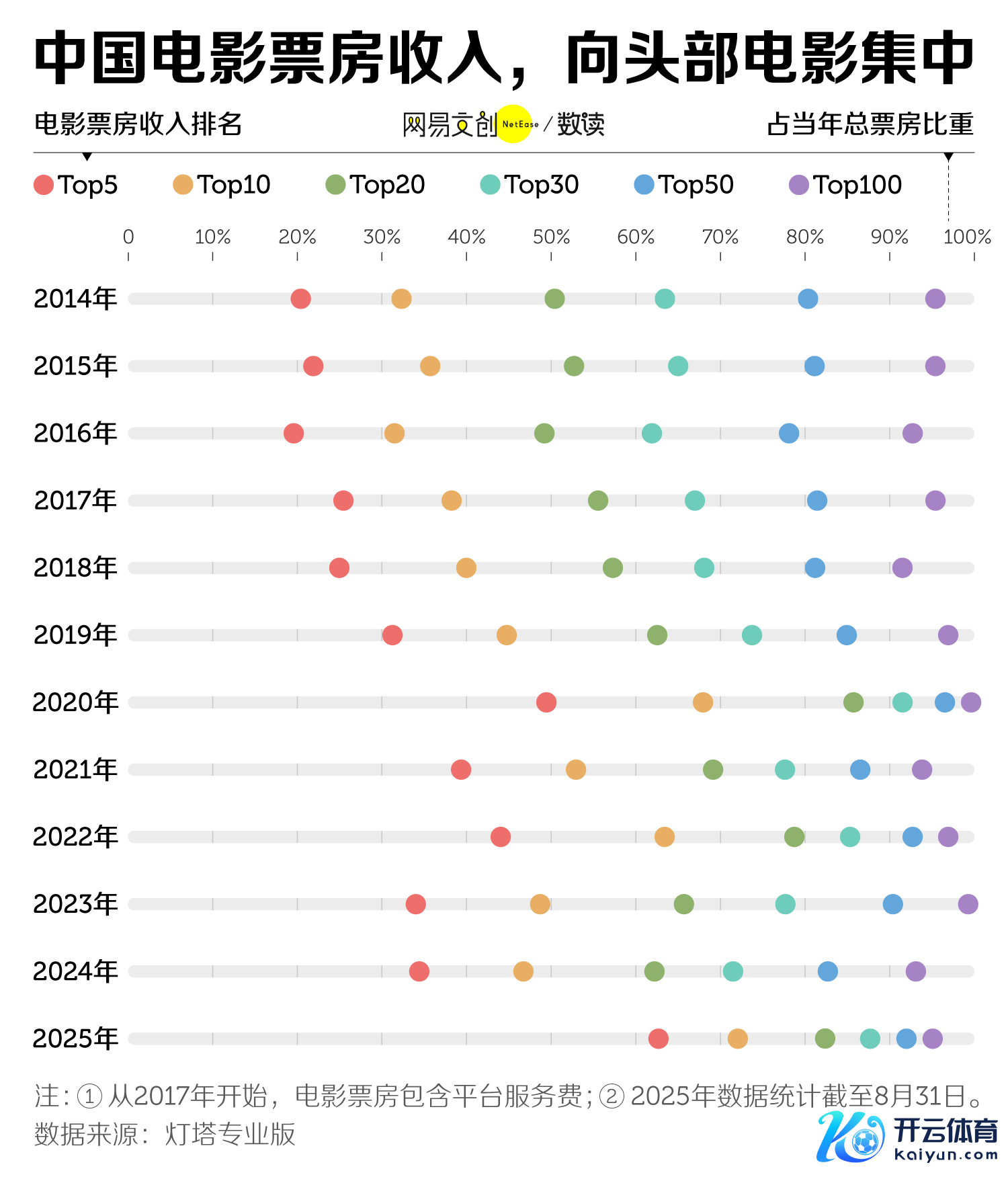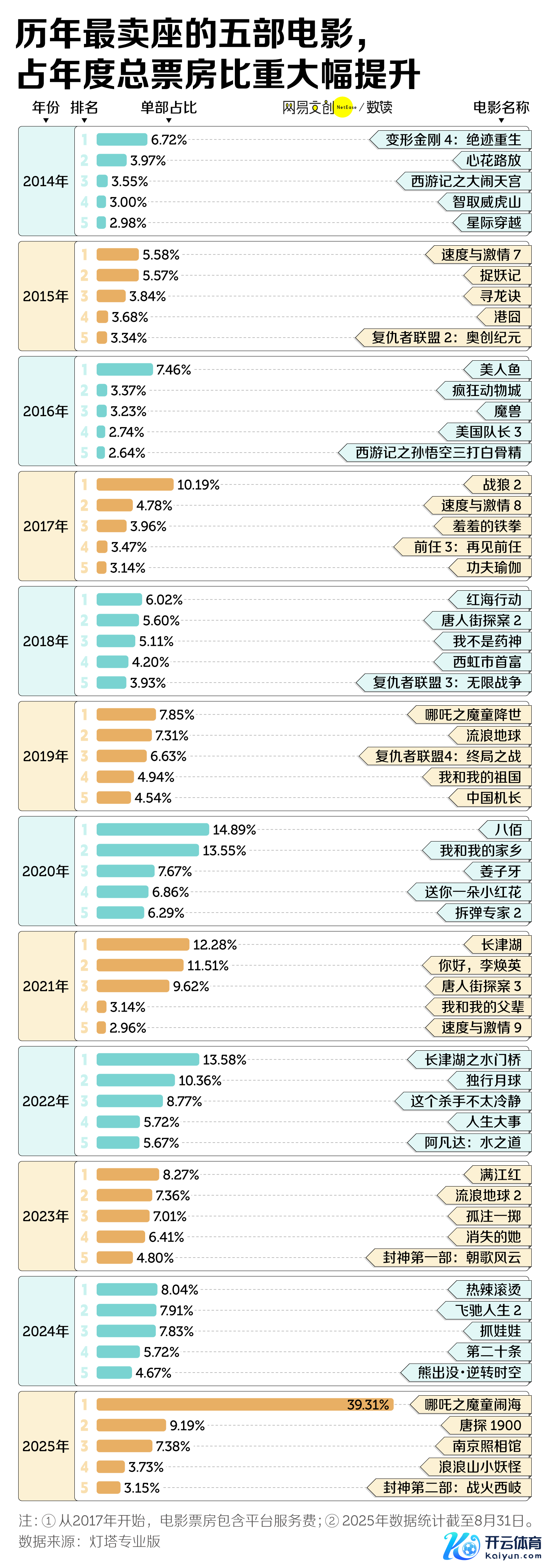2014年,前50名电影能收走80%-90% 的票房;到2024-2025年,只需要前20部就能拿走60%-80%票房。前五名电影所占的票房份额,也从已往的两成攀升至三成致使更多。