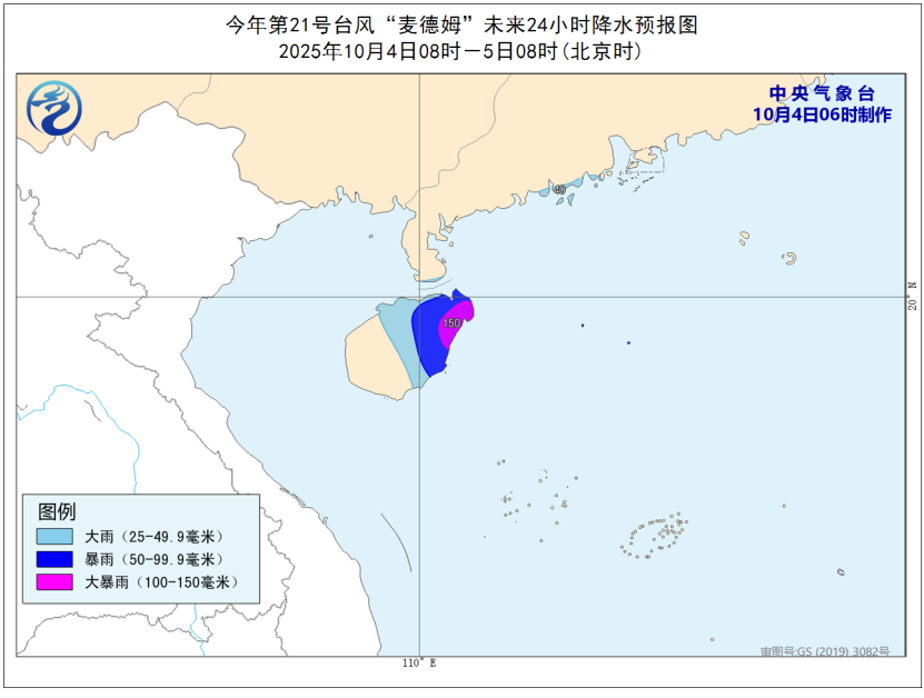 降水预告:4日08时至5日08时,广东西部沿海、海南岛中东部有大到暴雨,其中,海南岛东北部有大暴雨(100-150毫米)。