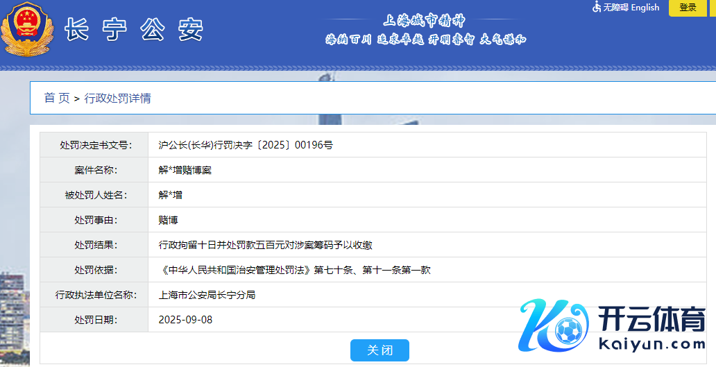 9月8日,上海市公安局长宁分局公布的行政处罚决定书显现,解某增因赌博被行政拘留旬日并处罚金五百元,对涉案筹码赐与收缴。